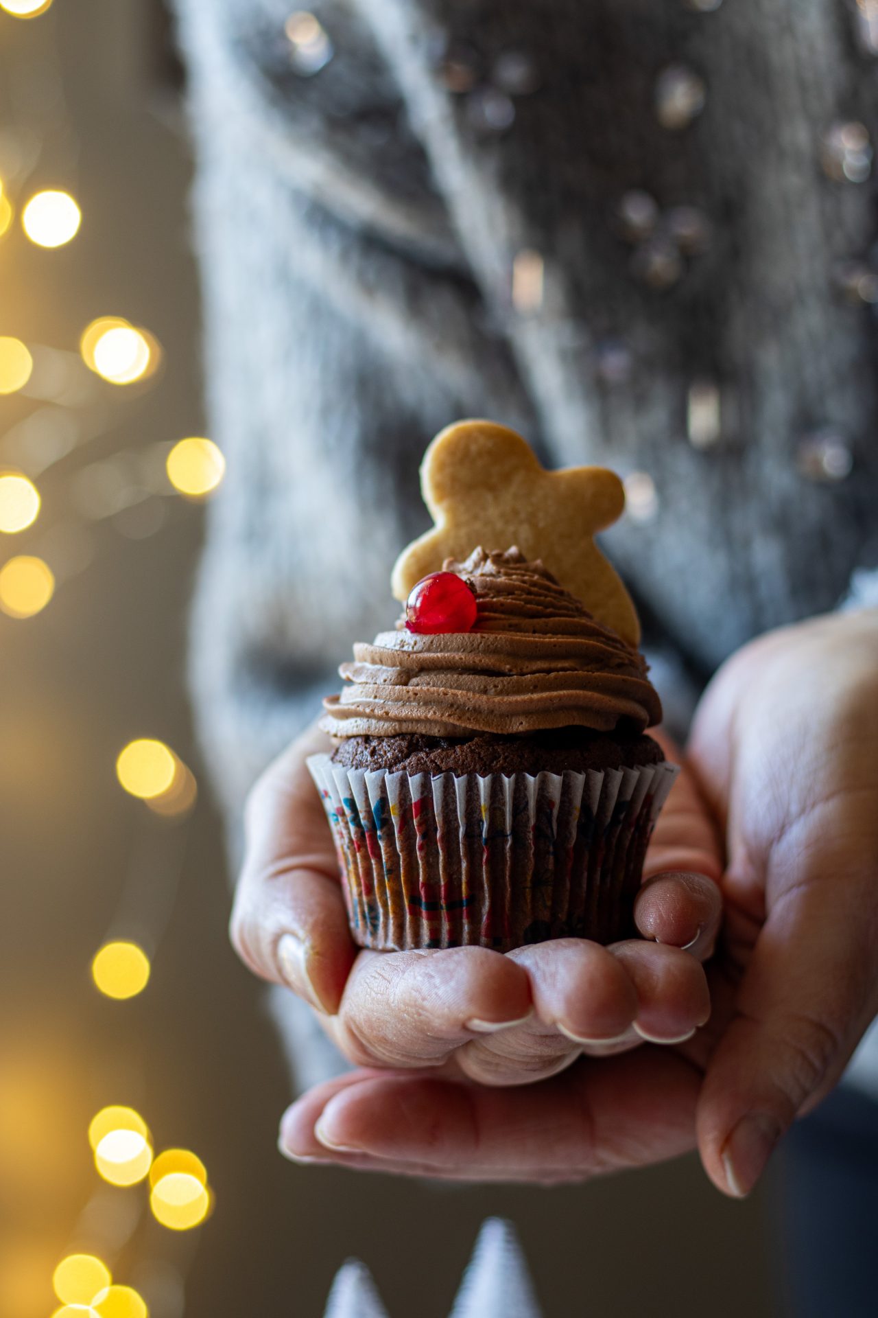 Place the topping mixture in another piping bag with a star nozzle and decorate the cupcakes. Add some currants, biscuits and golden powder.