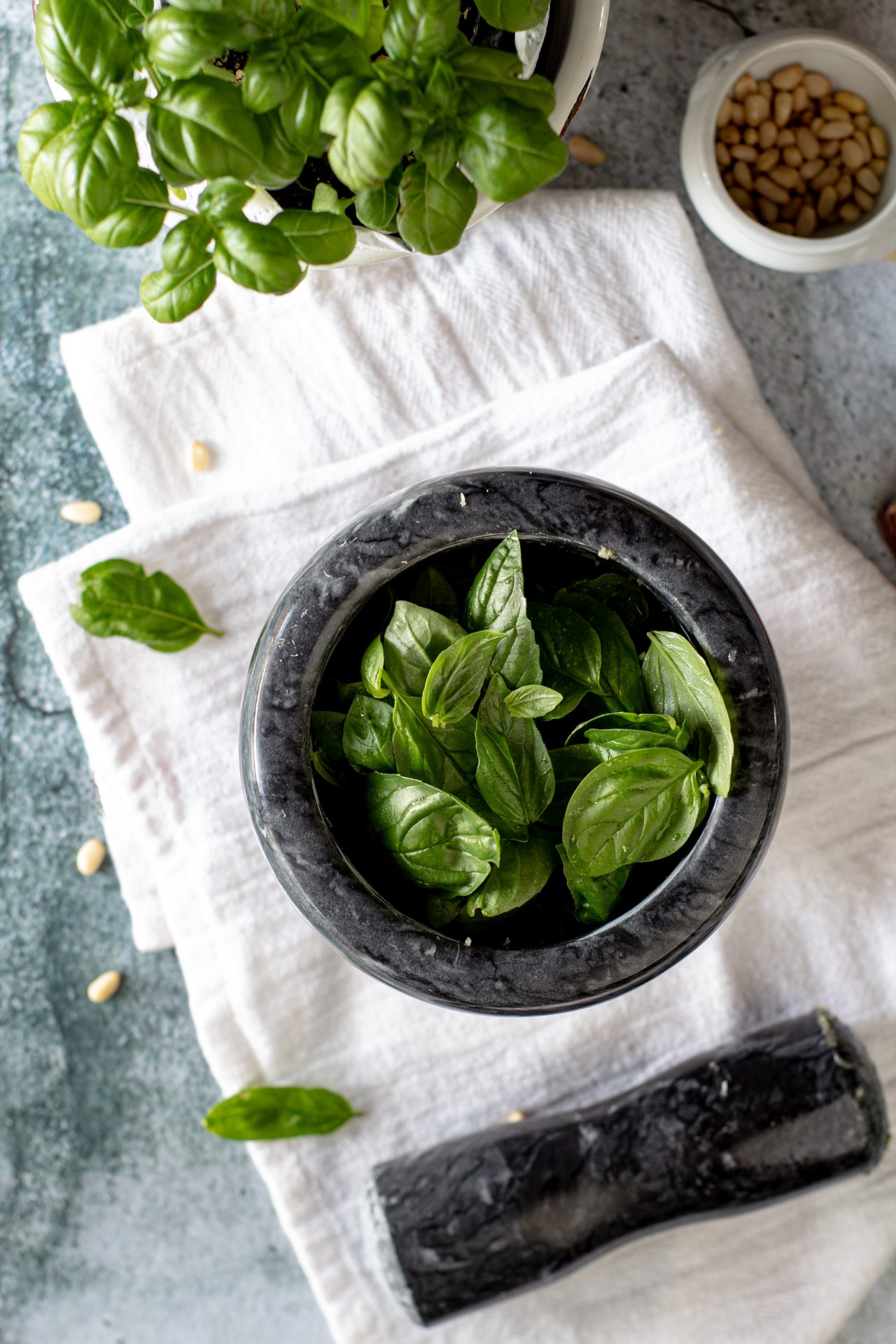 - Choose Genoese basil, the one with small leaves and make sure the leaves are all not too ripe. Avoid basil that is already in flower as this will make the pesto too strong in flavour.